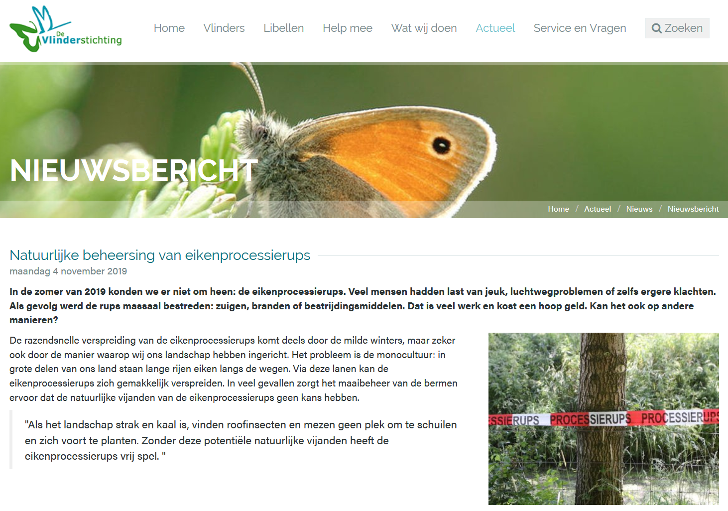 De eikenprocessierups: Er zijn natuurlijke manieren om de overlast in te dammen. Lees meer hier over op de website van de Vlinderstichting: