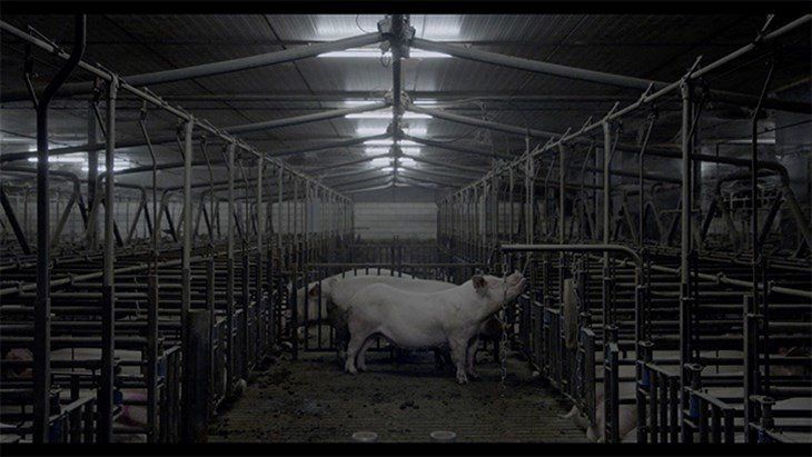Een aangrijpende scène in de film is het moment dat een groepje schapen langs het raam van de varkensstal loopt en naar binnen kijkt. De varkens in hun smerige hok kijken nieuwsgierig terug. Na een poosje vertrekken de schapen weer. ‘Dit is eigenlijk zo absurd.’ zegt Anne Minou. ‘De varkens zien de dieren buiten, maar zelf zullen ze nooit buiten komen. Waarom maken wij zoveel onderscheid in hoe wij met verschillende dieren omgaan?' (lees verder onder de foto)