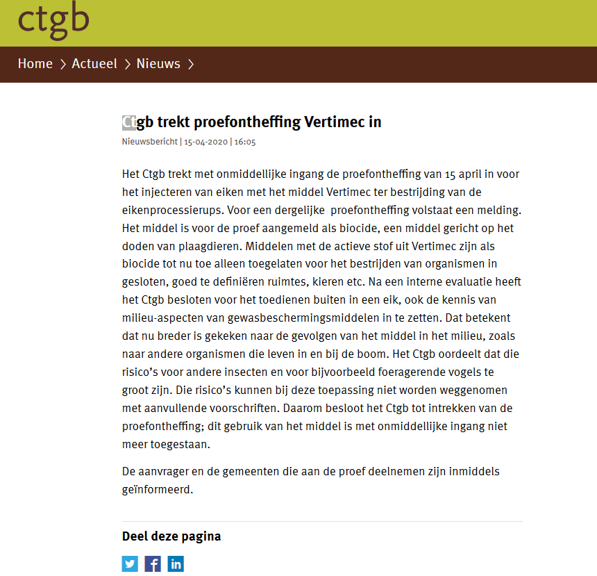 Vorige week heeft De Vlinderstichting een bezwaar ingediend tegen de ontheffing die was verleend om het middel Vertimec te injecteren in eiken. Wij kunnen gelukkig melden dat de ontheffing die men had gekregen voor een proef hiermee is ingetrokken.