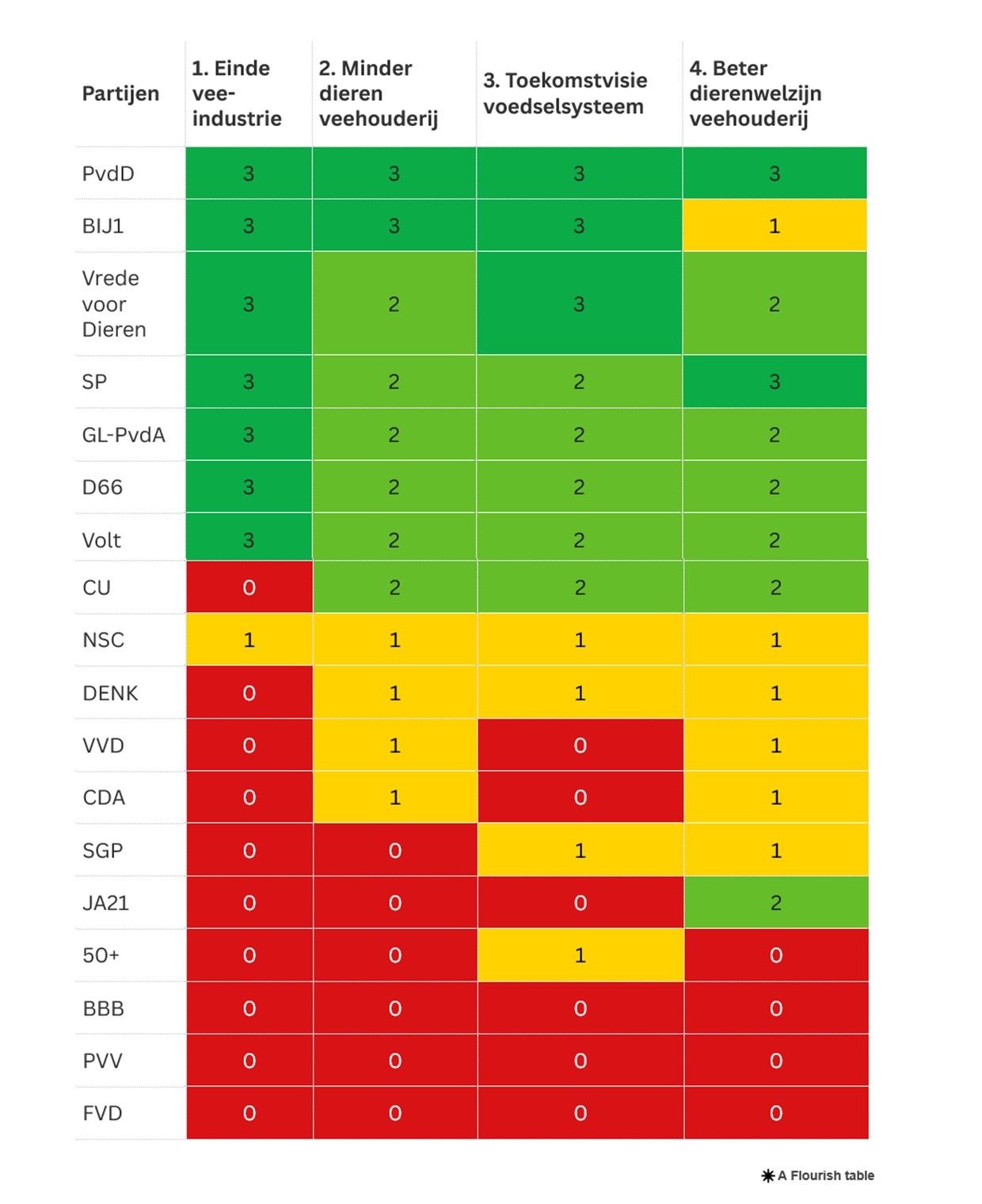 Hoewel de Partij voor de Dieren de meest dier- en natuurvriendelijke voorstellen heeft, willen ook GroenLinks-PvdA, Volt, D66 en de SP een krimp van de veestapel en een omschakeling naar landbouw die natuur en dieren respecteert. Daartegenover staan partijen als BBB, PVV, FVD, CDA en JA21, die de huidige veehouderij willen beschermen of zelfs uitbreiden. Zij zien technologische oplossingen als voldoende of wijzen krimp van de veestapel af. Partijen als NSC, ChristenUnie en DENK kiezen een middenweg: ze erkennen dat minder dieren houden onvermijdelijk is, maar willen dat vooral via vrijwillige maatregelen en innovatie laten verlopen.
